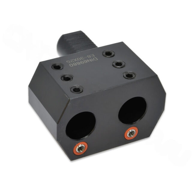 Двойной резцедержатель для цилиндрического хвостовика VDI типа E8 предназначен для фиксации расточных резцов с хвостовиком диаметром 32 мм. Хвостовик имеет размер VDI50. Блок VDI чаще всего используется для крепления расточных резцов и другого осевого инструмента, когда требуется наружная подача смазочно-охлаждающей жидкости.